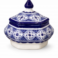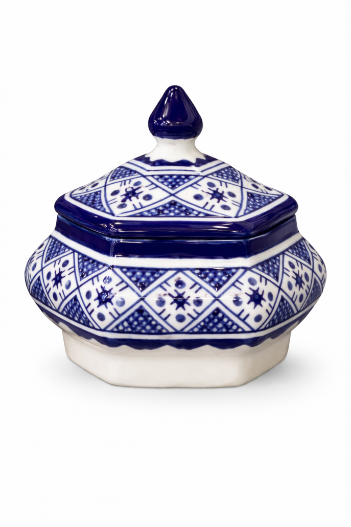 سكرية خزفية مغربية مصنوعة يدويًا في فاس، ومزخرفة بنقوش تقليدية مستوحاة من فن الخزف المغربي الأصيل.