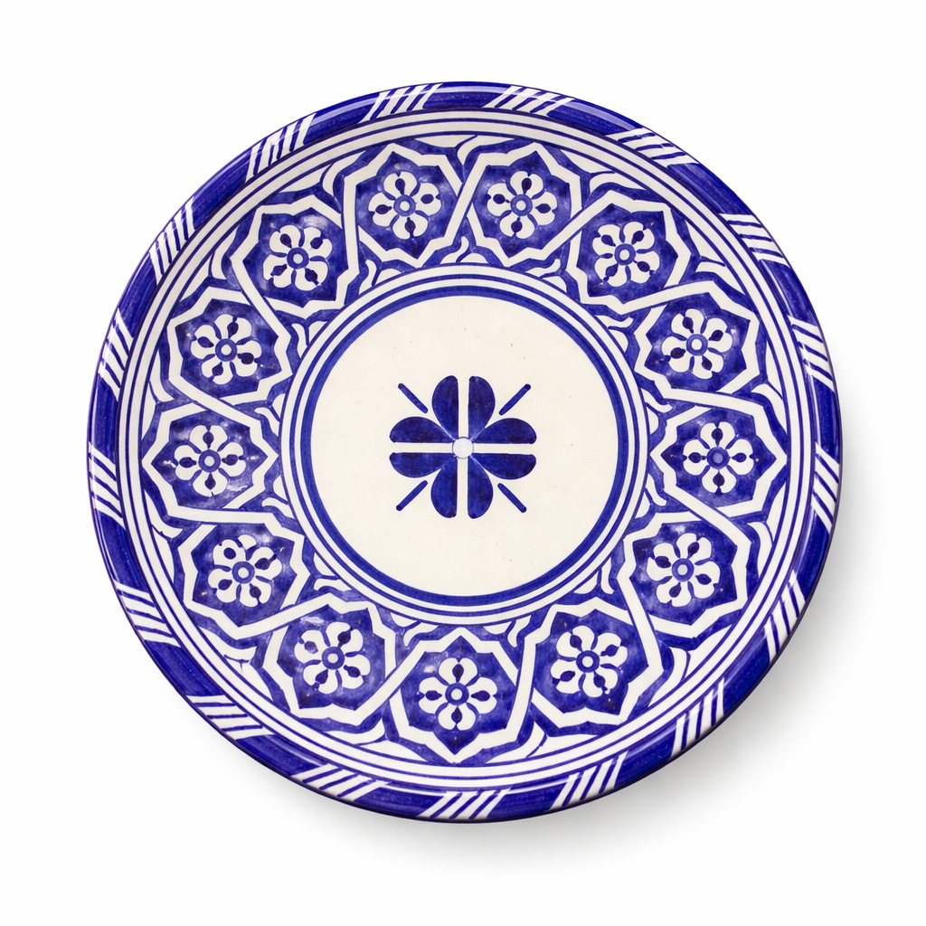 طبسيل مدور أبيض مصنوع يدويًا من الخزف المغربي التقليدي، يتميّز بتصميمه البسيط والأنيق الذي يناسب جميع أنماط المائدة، من الاستخدام اليومي إلى التقديم في المناسبات الخاصة. اللون الأبيض الخالص يمنحه طابعًا عصريًا مع الحفاظ على روح الحرفية المغربية الأصيلة.
