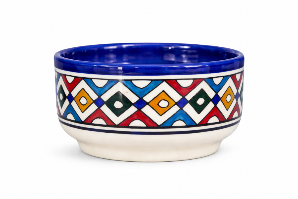هذا الوعاء الخزفي المغربي المزخرف هو قطعة فنية تجمع بين الحرفة التقليدية والجمال العملي.